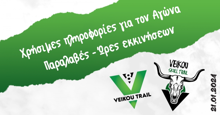 Η Οργανωτική Επιτροπή του 8ο Veikou Trail ενημερώνει τους συμμετέχοντες δρομείς, ότι η παραλαβή των πακέτων συμμετοχής, όπως είναι γνωστό και από την προκήρυξη της διοργάνωσης, θα πραγματοποιηθεί μόνο το προσεχές Σάββατο 20/01 (μία ημέρα πριν την διοργάνωση), από το σημείο που έχουν επιλέξει κατά την εγγραφή τους. Οι ώρες παραλαβής αναφέρονται παρακάτω: